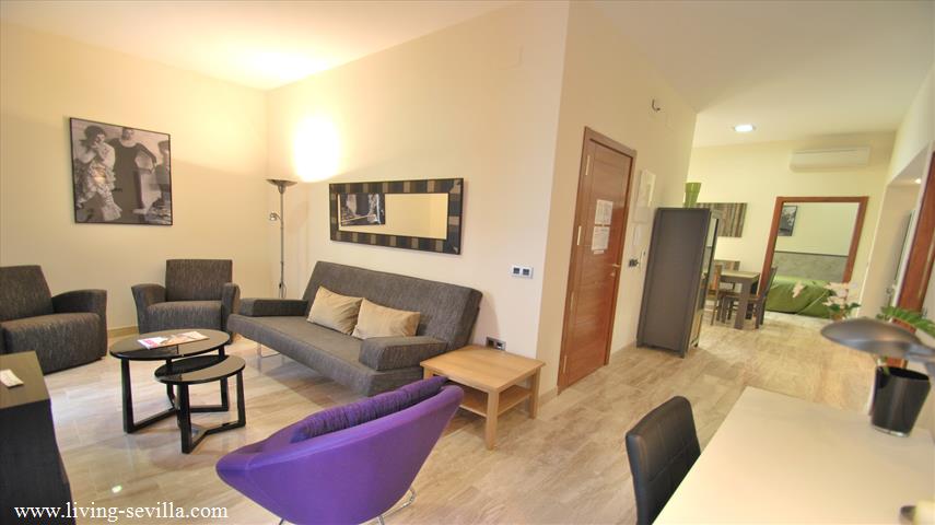 Situado en la segunda y tercera planta. El apartamento está equipado con sábanas, mantas y toallas. Living Sevilla Apartments, a su vez, como cortesía, equipa el apartamento con jabón de tocador, papel higiénico, detergente, bolsas de basura, jabón lavavajillas de "bienvenida".